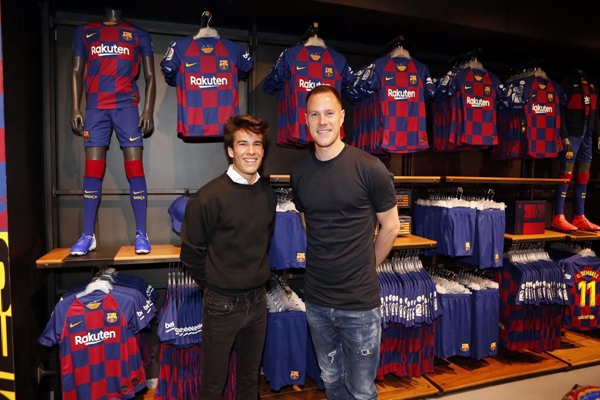 O guarda-redes Marc-André ter Stegen e o estrela do FC Barcelona, Riqui Puig, acompanhados pelo Presidente Josep Maria Bartomeuto, vêem as novas Camisolas de futebol do FC Barcelona no Camp Nou.